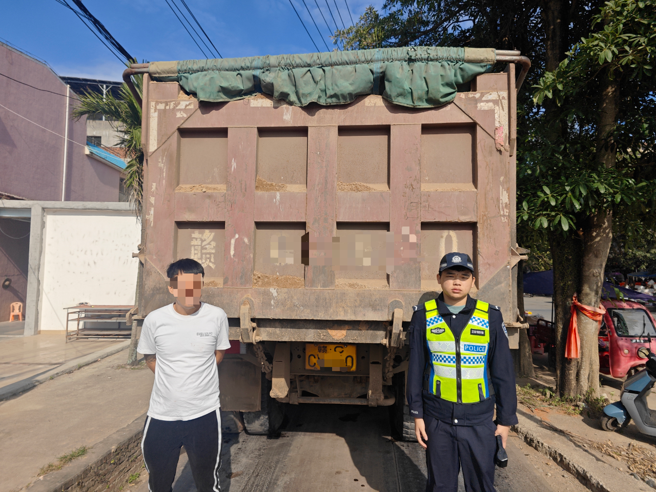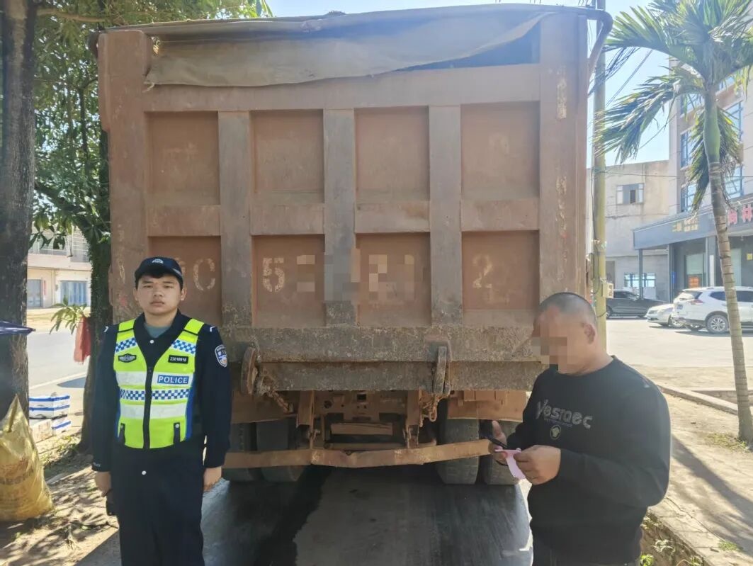 同日11时44分许,永发中队民辅警在海榆中线33公里100米处,查获另一辆涉嫌超载的重型自卸货车(车牌号:琼C5***2)。该车后车厢内有河砂散落,经核查总重量达49.3吨,超载幅度同样为百分之百。驾驶人周某因存在与王某类似的三项交通违法行为,被澄迈交警依法处以驾驶证记6分、罚款2300元、暂扣车辆的处罚。