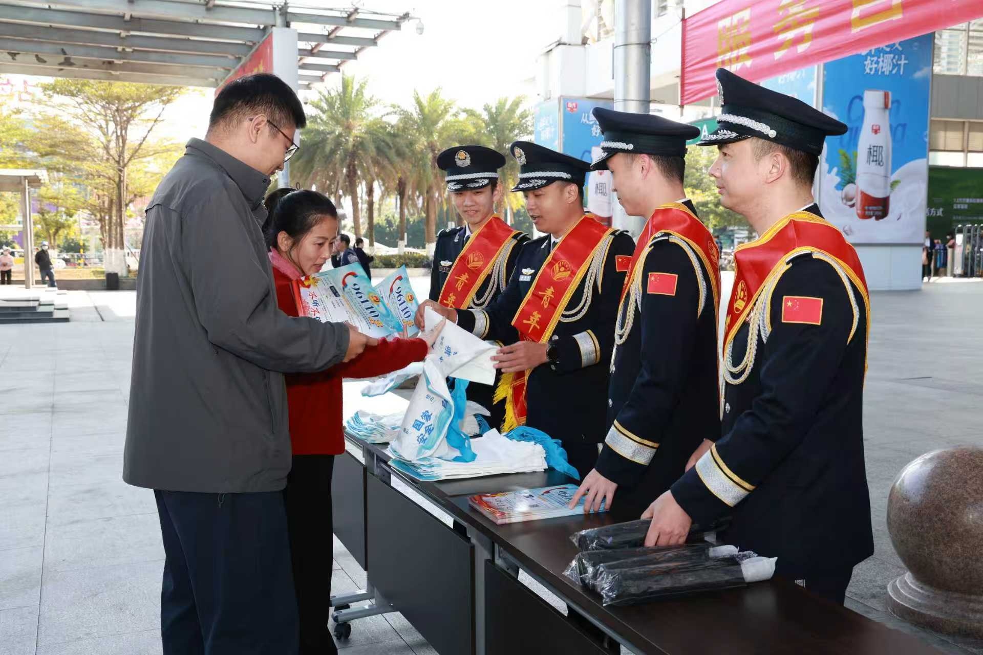 作为全国青年文明号,海口东站派出所执勤队同步开展“铁警伴你行,服务自贸港”主题志愿服务活动。民警在车站设置宣传台,通过发放宣传单、组织乘车安全知识有奖问答等形式,向旅客普及防诈防骗及铁路安全知识,同时提供咨询引导、答疑解惑等服务,详细宣讲易燃易爆物品进站乘车的危害,并邀请旅客参与互动小游戏,既密切了警民关系,又有效提升了旅客安全意识,营造出平安有序、温馨和谐的出行环境。