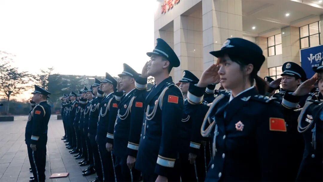 上午8时,参加仪式的全体民警身着警礼服,整齐列队,警容严整,精神昂扬。护旗方队步伐铿锵,护卫着红蓝相间的警旗走向升旗台。在激昂的《中国人民警察警歌》声中,警旗冉冉升起,全体民警庄严敬礼,炽热目光追随旗帜升至顶端。