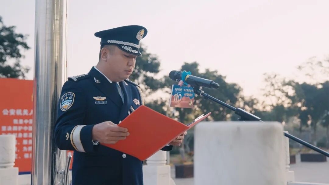 “我是中国人民警察,我宣誓……”在副县长,县公安局党委书记、局长黎凯的领誓下,全体民辅警高举右拳,面向警旗重温入警誓词。铿锵有力的誓言在空中回荡,彰显了澄迈公安忠诚履职、无悔担当的坚定信念。