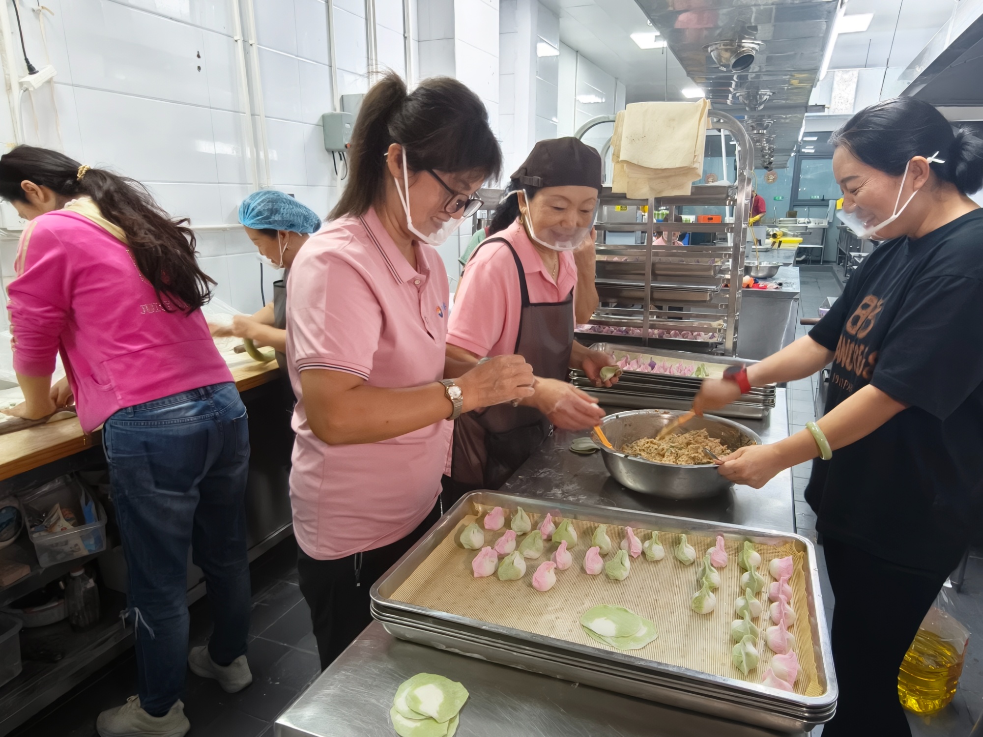三亚夏日海岸旅居中心负责人李钰霞和工作人员一同包过年水饺。袁卅 摄
