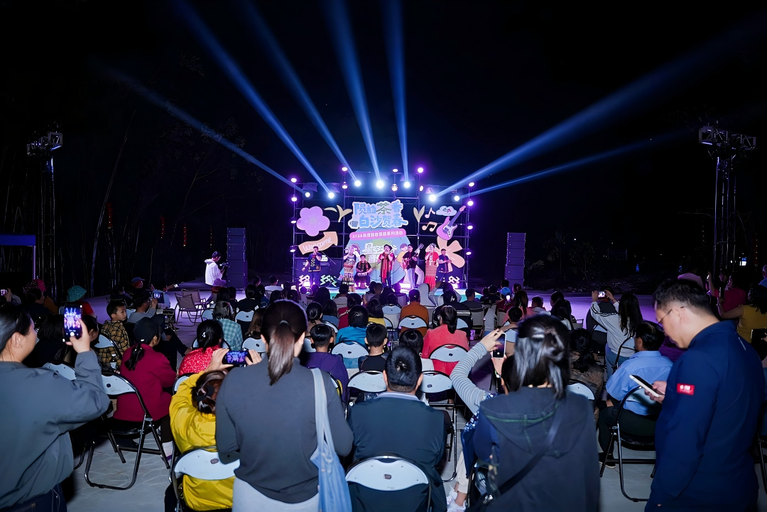午后,茶园长桌宴率先开席,游客与亲朋好友围坐在一起,共享白沙特色美食,共赏万亩茶园风光;茶园市集里,农特产品、特色美食摊位琳琅满目,吸引不少游客驻足选购;傍晚,茶园烧烤区香气弥漫,游客们围坐品尝,欢声笑语不断;星空茶谷音乐会准时上演,民族乐器与潮流音乐碰撞出独特火花,游客们在茶香中跟着节奏尽情欢唱,将新春氛围推向高潮。