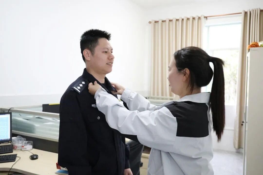 她们为爱人整理警容,指尖拂过肩章,停顿片刻,仿佛要把所有的牵挂与叮咛,都缝进那一片藏蓝里。民警们望着眼前人,眼里有歉意,也有暖意——从警多年,家人早已习惯了他们在团圆时刻的缺席,却从未少过对他们的支持。