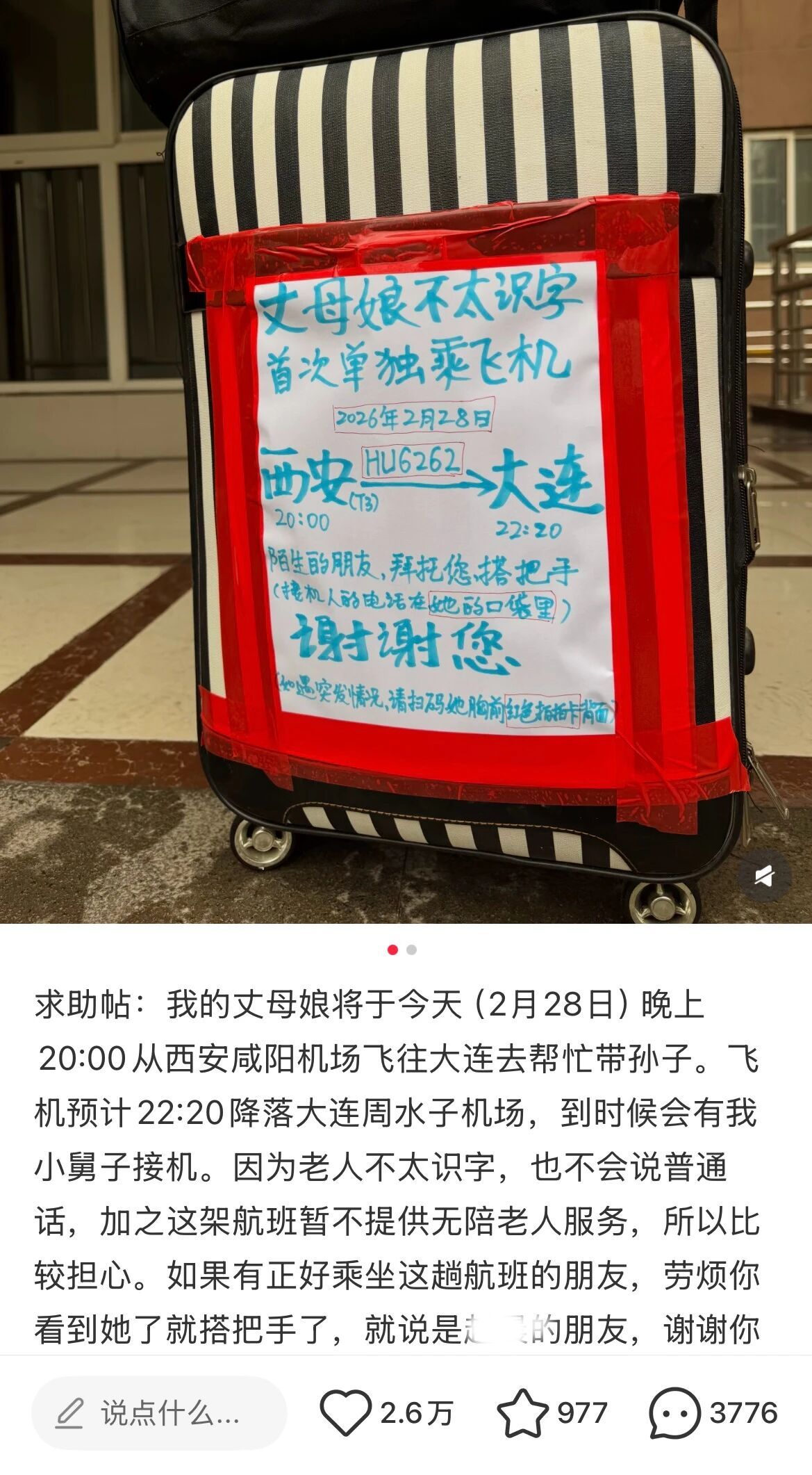 2月28日晚8点,西安飞往大连的HU6262航班即将起飞。与此同时,一条带着牵挂与忐忑的小红书求助帖在网络上迅速发酵:“丈母娘不太识字,首次单独乘飞机……”