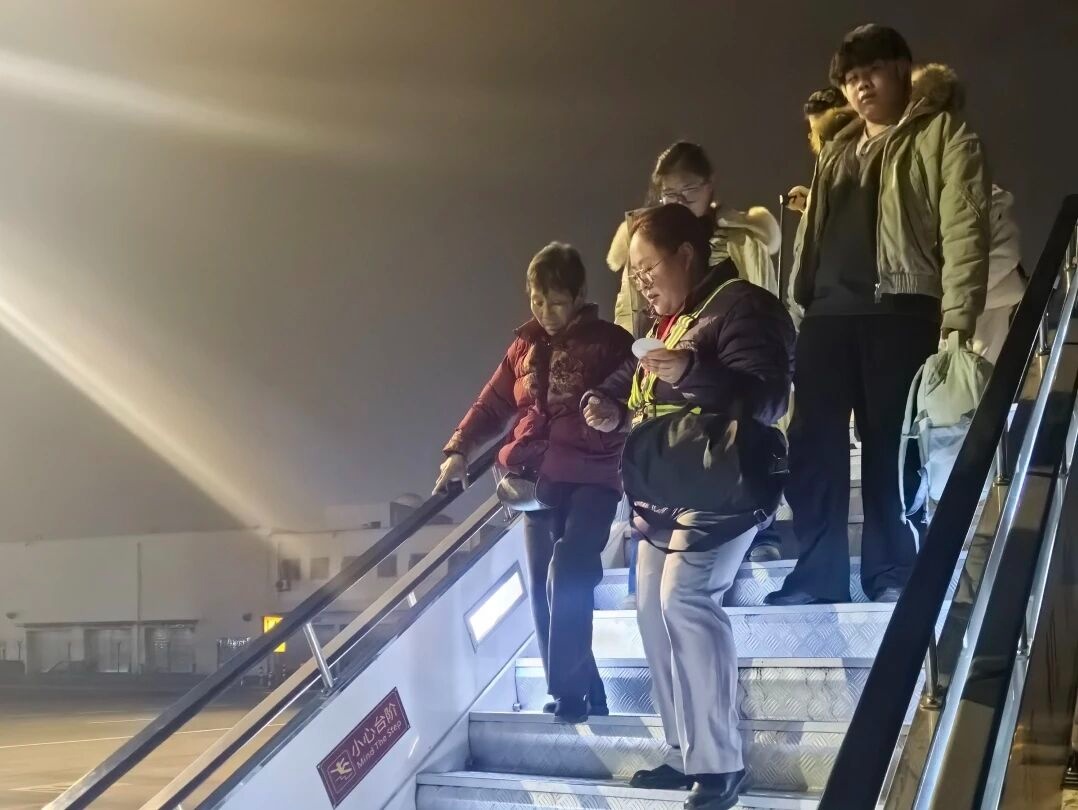 飞机缓缓降落在大连周水子国际机场。客舱门打开,刘茜倩第一个走进来。她看到老人脸色不太好,还捂着嘴,赶紧递上一杯温水,轻轻扶住老人。“阿姨,我是来接您的,别怕,跟我走。”