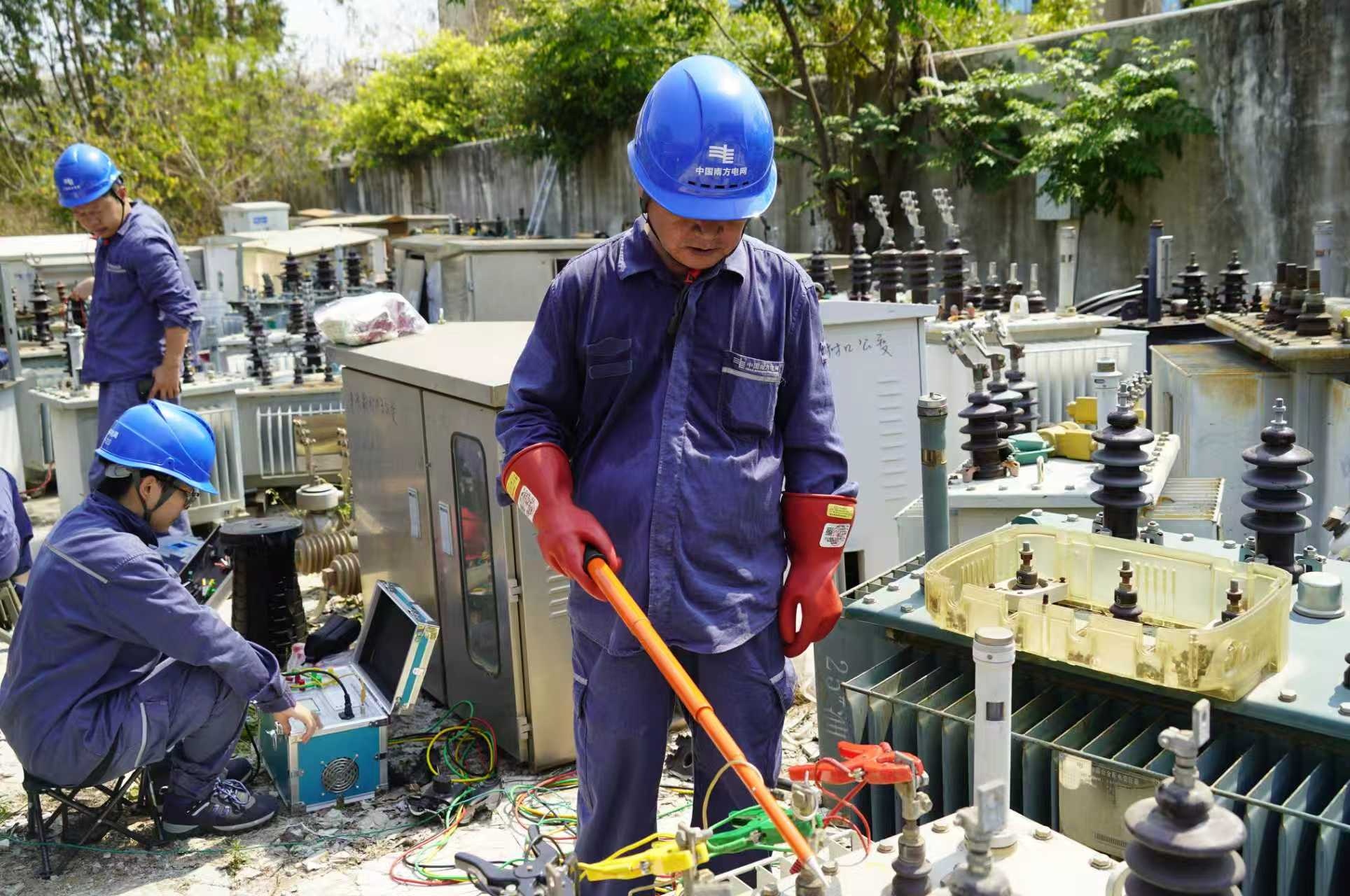 儋州供电局员工在烈日下的露天试验场对退运变压器进行直流单组测试。赵佳文 摄
