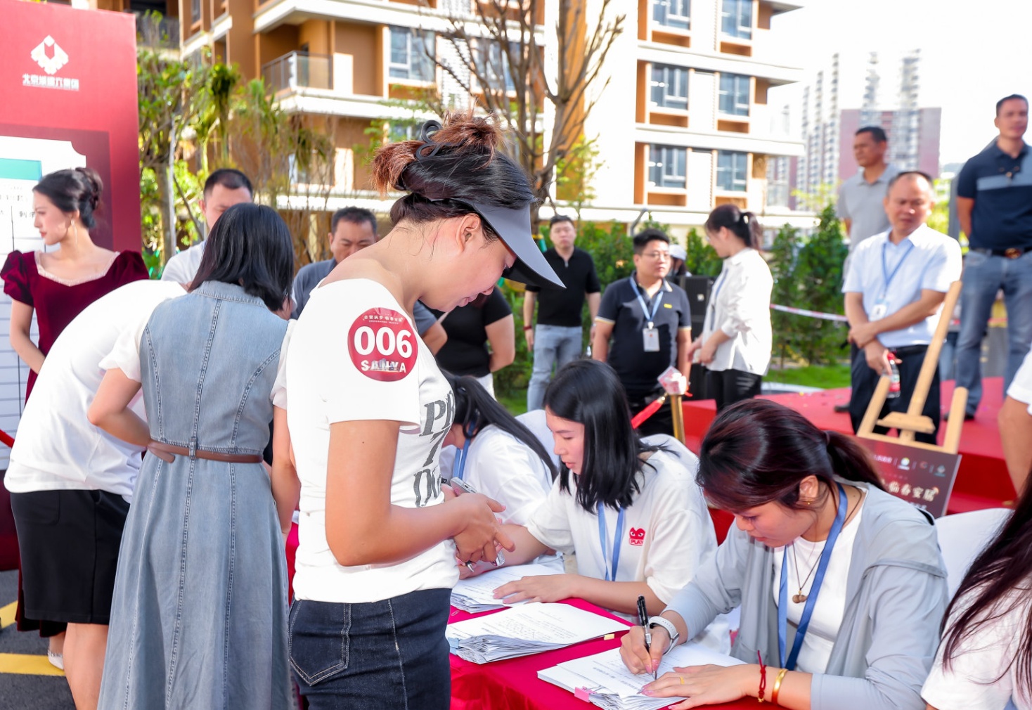 当天上午9时许,临春村安置区(一期)选房现场已人头攒动。签到摇号区前,居民们按顺序出示相关材料,工作人员逐一核实信息、发放选房姓名贴,三亚市凤凰公证处的公证员全程站在旁侧进行监督记录,确保公平公正。