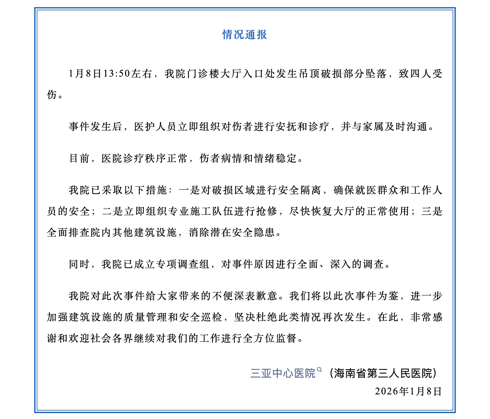 1月8日13:50左右,我院门诊楼大厅入口处发生吊顶破损部分坠落,致四人受伤。事件发生后,医护人员立即组织对伤者进行安抚和诊疗,并与家属及时沟通。目前,医院诊疗秩序正常,伤者病情和情绪稳定。