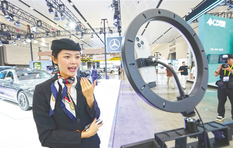 主播在现场推介新能源汽车。海南日报全媒体记者 陈元才 摄