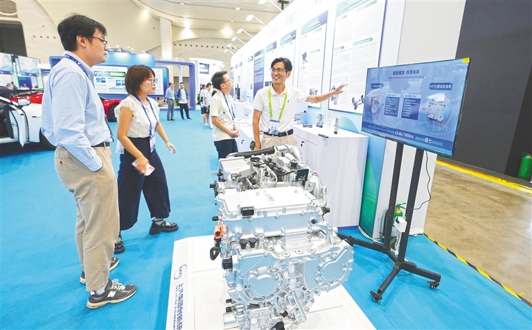 参观者在了解一款新能源汽车混动系统。海南日报全媒体记者 陈元才 摄