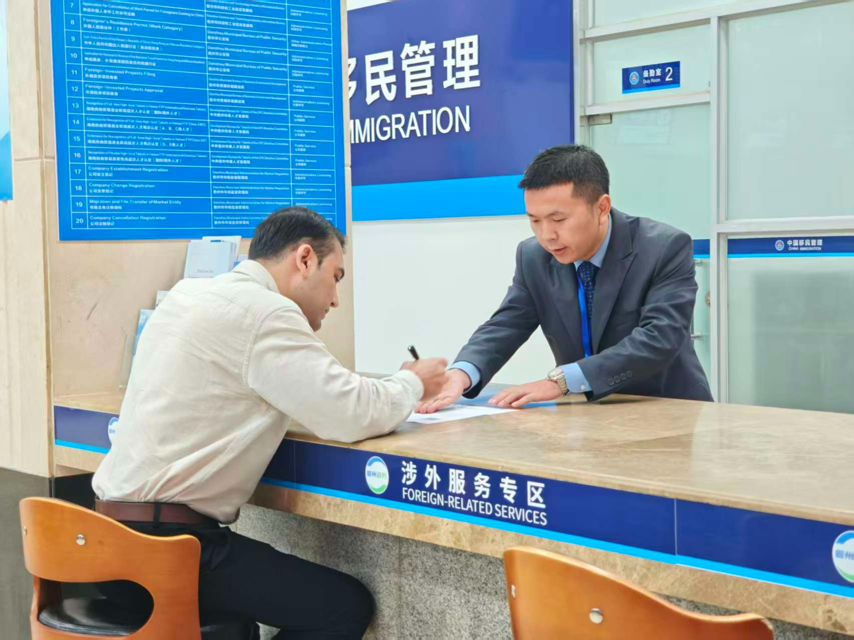 萨德可汗在工作人员的指导下填写表格(央广网记者 蔡文娟 摄)