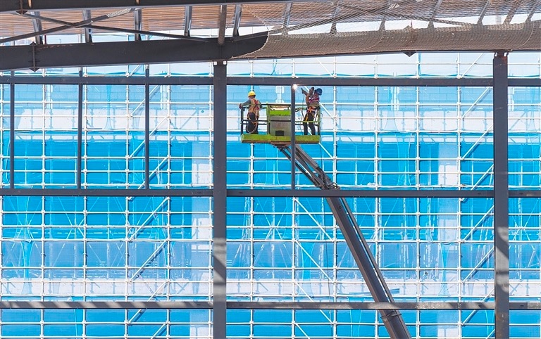 12月24日,海南国际智慧物贸云港项目建设现场,施工人员有序开展作业。目前,项目已进入室内二次结构与外墙工程阶段,预计春节前完成全部砌体施工,确保2026年8月如期竣工。