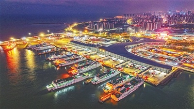 1月4日晚间,海口市新海港码头灯火通明,客滚船有序进出港,一派繁忙景象。作为海南自贸港连接内地的重要枢纽,封关运作后的新海港客货运输量呈现稳健增长态势。码头启用“一站式通关”模式,新增自助申报通道,配合线上预约服务,通关效率大幅提升。(记者 陈元才 摄)