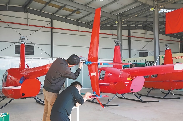 近日,在白沙元门机场维修作业区,机务工程师对一架R44罗宾逊直升机进行拆卸检查。(白沙融媒体中心供图)
