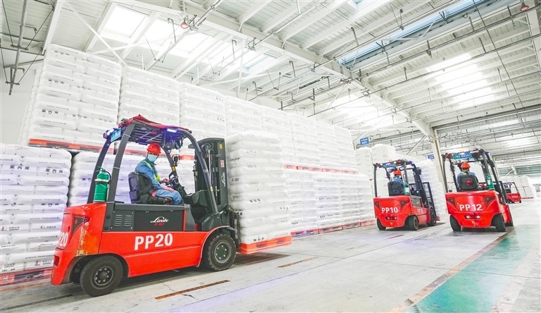 近日,中国石化海南炼化公司乙烯区聚丙烯包装车间产销两旺,多条生产线满负荷运转,均聚产品PPH-M17经严格检验后批量打包出库,即将发往内地,全力保障民生及产业端多元需求。