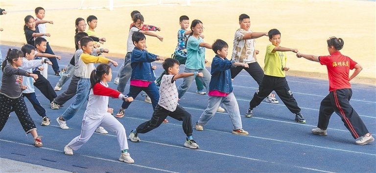 1月19日,海口市美灵小学学生在上武术课。海南日报全媒体记者 袁琛 摄