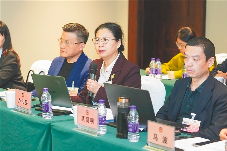 图为海南省政协委员卢伟英(中)发言