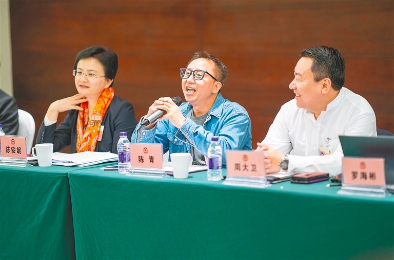 图为省政协委员陈青(左)发言