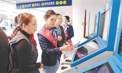 2月2日,2026年春运正式拉开大幕,为期40天的客流运输保障工作全面启动。作为琼州海峡核心交通枢纽,海口新海港提前部署、全力备战,确保春运运输秩序平稳有序。图为新海港自助售票机前,工作人员指导旅客购票。(记者 邱肖帅 摄)