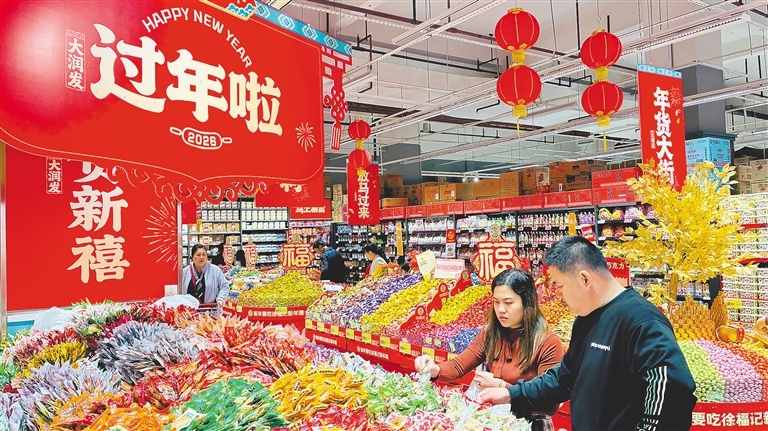 农历马年春节将至,海口许多超市通过打造“一站式”年货购物体验,满足市民多元化消费需求,椰城年味正浓。2月3日,海口市大润发超市年货大街红火开街,洋溢着喜庆祥和的节日氛围。货架上各色礼盒、干果特产琳琅满目,市民们穿梭其间精心挑选年货,现场人头攒动、购销两旺。记者张茂 实习生柳一诺 摄