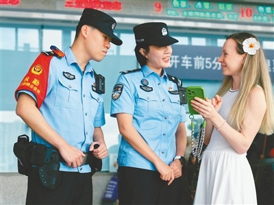今年春运期间,三亚入境旅游市场持续升温。针对外籍旅客不熟悉出行流程、语言沟通不畅等难点,近日,海口铁路公安处三亚站派出所推出暖心服务举措,在购票窗口、安检口、候车专区等区域,专门设置“双语服务岗”,抽调精通英语的骨干民警值守,为旅客提供购票指导、乘车指引、咨询解答等服务。(记者邱肖帅 通讯员蔡鸿君 图/文)