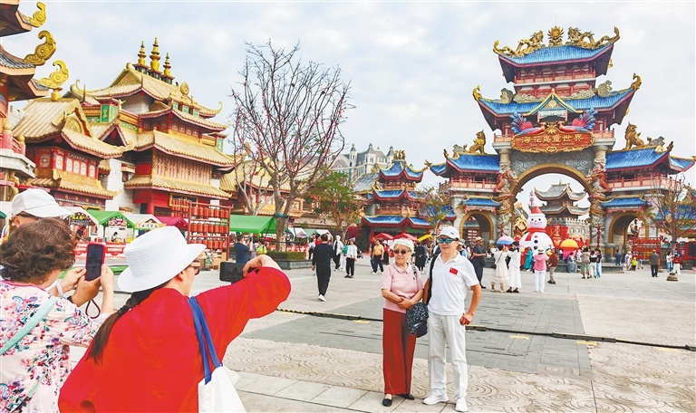 2月17日,大年初一,儋州市海花岛童世界张灯结彩,年味十足,众多市民游客前来游玩,开启新春欢乐之旅。图为游客在打卡拍照。(记者 陈元才 摄)