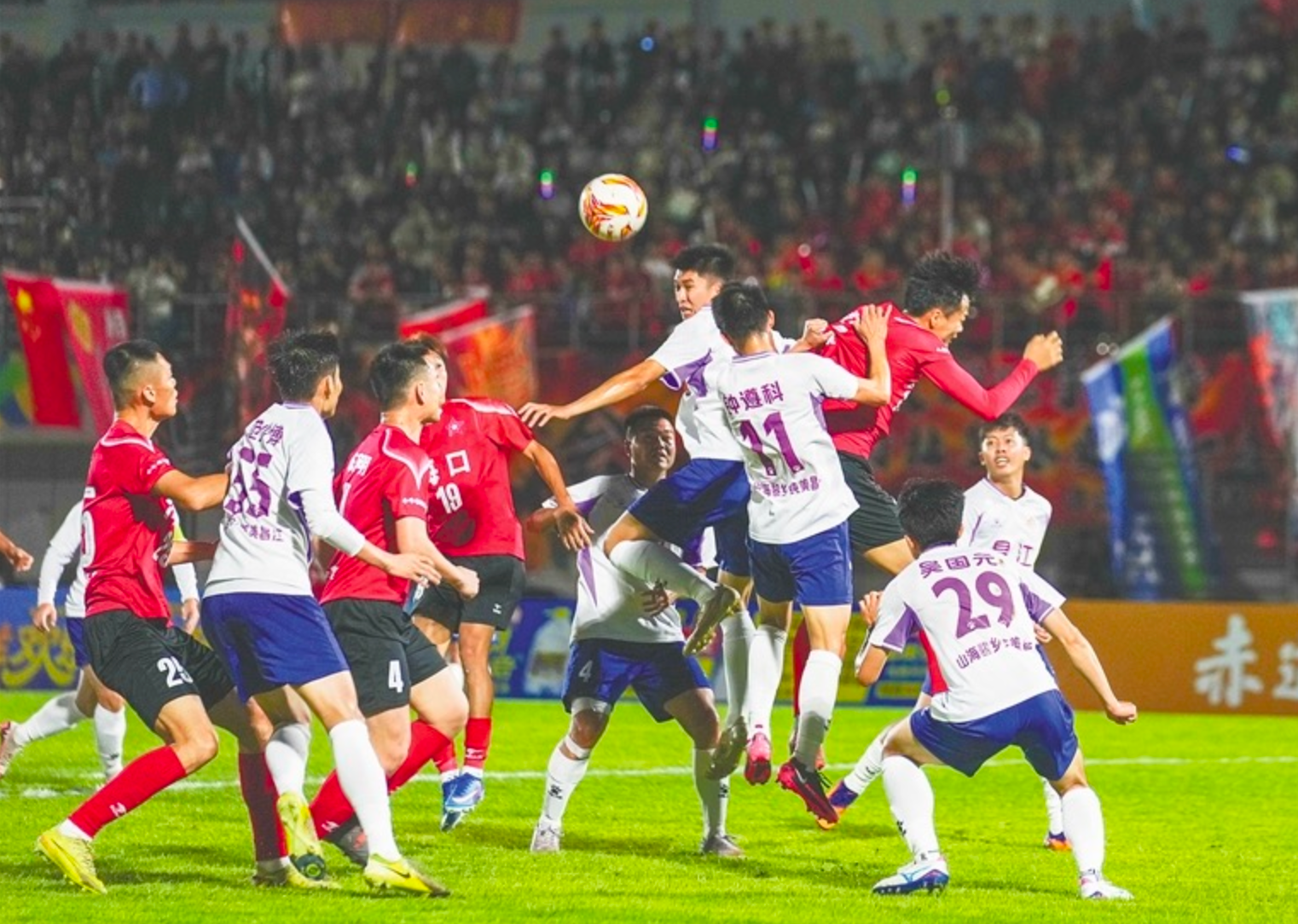 3月15日晚举行的琼超半决赛中,海口队(红衣)和昌江队的队员争抢头球。 海南日报全媒体记者 李天平 摄