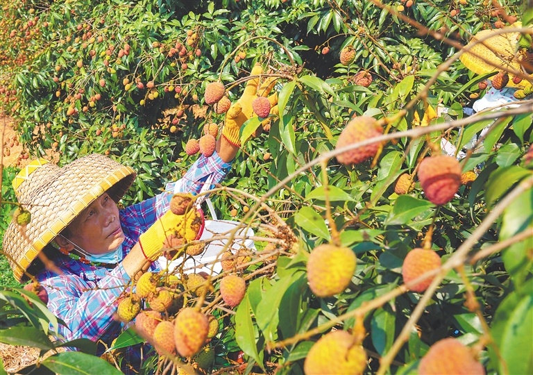 3月19日,乐东黎族自治县万冲镇“桂花香”荔枝果园里,工人忙着采摘荔枝。连日来,“桂花香”荔枝陆续进入成熟期,以“上市早、口感佳、品质精”的核心优势抢占鲜果市场先机,受北京、上海等地市场青睐,每斤销售价可达50元至60元。(记者 刘操)