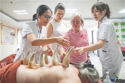 4月3日,外国游客在三亚国际友好中医疗养院体验学习海南黎医牛角拔罐技术。