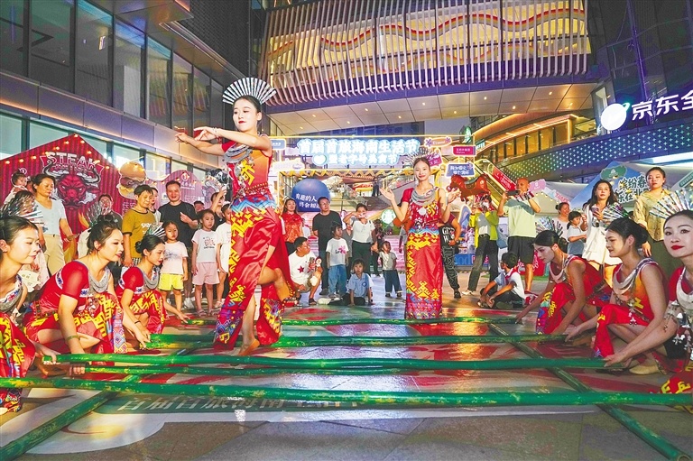4月10日,首届首旅海南生活节暨老字号美食节在海口王府井海垦广场启动。据悉,作为第六届消博会的重要配套活动,首届首旅海南生活节暨老字号美食节活动将持续到4月19日,每日17时至22时开启集合市集、美食、音乐的夜间嘉年华,为消博会增添夜间文旅消费亮点。图为活动现场表演竹竿舞。(记者武威 摄)