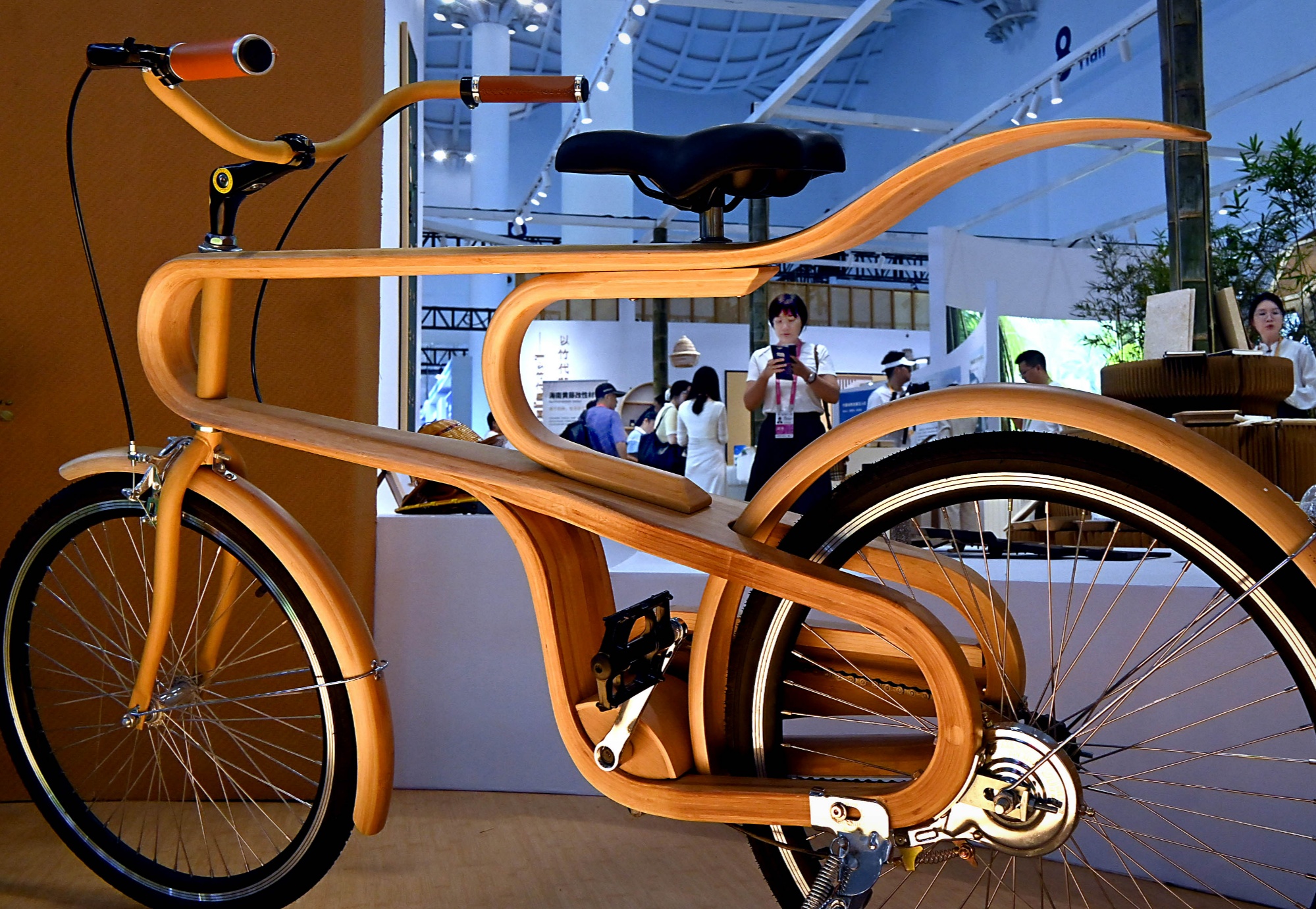消博会竹藤展上一辆以竹制品为骨架的自行车(央广网发 王颂 摄)