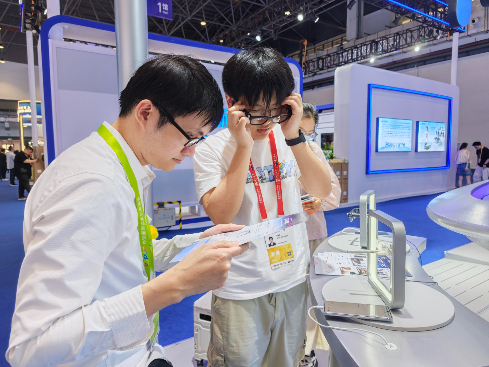 参展观众体验佩戴AI眼镜(央广网记者 蔡文娟 摄)