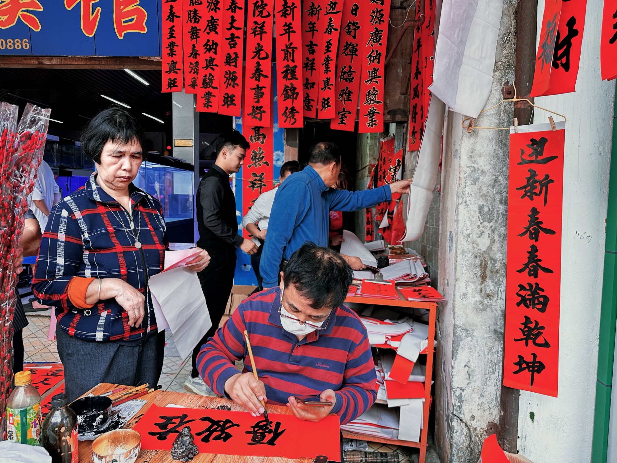 按照海南的传统,每到春节家家户户都要贴春联以表达对新年的美好愿望,在印刷体春联随处可见的今天,不少海南人还是喜欢手写的春联。相较于印刷的春联,人们会觉得手写的春联多了一些灵动气息,也增加了年味的乐趣。在海口博爱南路代写春联的卢灿,平日工作是在学校里教书法、美术。从自己年轻的时候,街坊四邻每每过年都要找他写上几副春联,后来他便在博爱南路支了个摊子,年前专门帮人代写春联,一写就是二十几年。他说,在海南很多人以出海打渔为生,所以不少人会找他写“保我子孙”一类的春联,祈祷家人出海平安顺利。