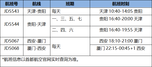 2026年民航夏秋航季将于3月29日开启,为顺应航空市场出行需求变化,完善国内航线网络布局,加强区域间交通互联互通,新海航航空集团旗下首都航空积极优化运力配置,计划在3月29日正式开通天津往返贵阳、西安往返厦门两条直飞航线。两条新航线的开通,将搭建起华北与西南、西北与东南沿海地区的高效空中桥梁,进一步畅通区域间人才、资本、文旅及商贸流通渠道,为区域经济协同发展注入民航新动能。