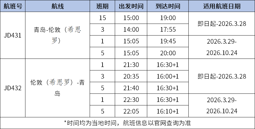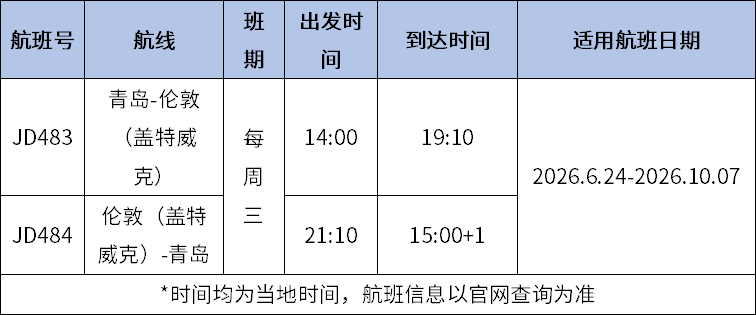 青岛往返伦敦(希思罗)航线航班时刻如下(均为当地时间,航班信息以官网查询为准):