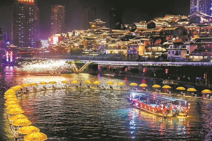 夜幕降临,宣恩县贡水河畔灯火璀璨,“龙游贡水”游船载着游客穿梭于光影之间