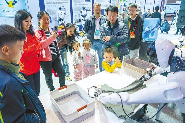 11月22日,中国光谷科技会展中心,观众在湖北人形机器人创新中心展台参观,人形机器人“表演”叠衣技巧。(湖北日报全媒记者 魏铼 摄)