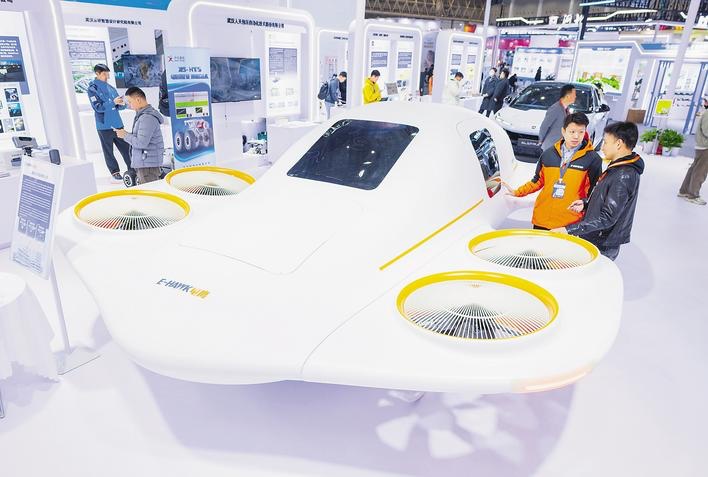 12月12日,2025武汉国际工业设计博览会上,武汉电鹰科技展出自主研发、能垂直起降的飞行汽车。(湖北日报全媒记者 柯皓 摄)