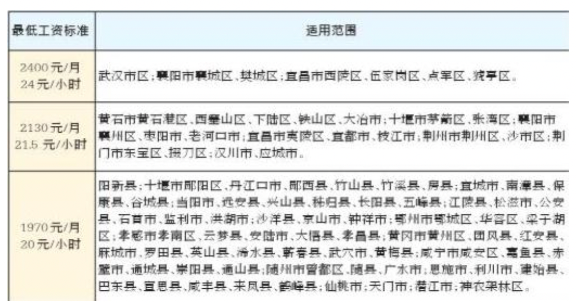 根据通知,全日制就业劳动者月最低工资标准按区域划分为三档,依次为2400元、2130元、1970元。其中,武汉市区和襄阳、宜昌部分区域为2400元,黄石、十堰、襄阳、宜昌、荆州、荆门部分区域和汉川、应城为2130元,其他区域为1970元。