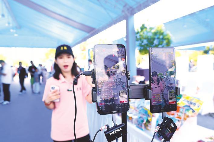 在2025“乐购湖北 金秋潮荟”消费季启幕现场,某生物公司主播现场直播卖货。 (湖北日报全媒记者 周鹏 摄)