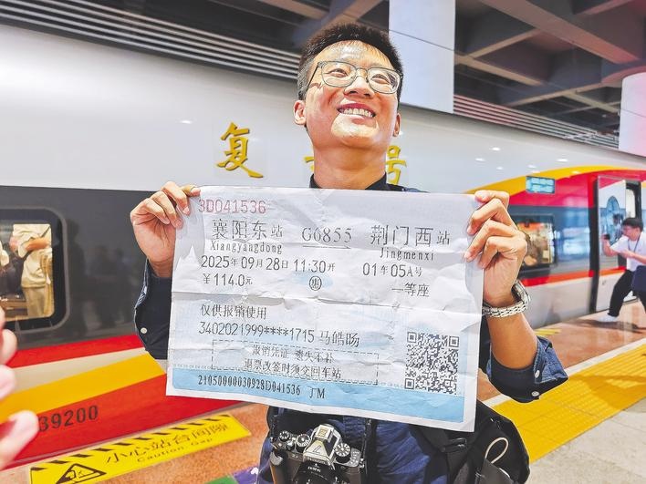 乘坐襄荆高铁首发列车的旅客展示车票放大票样。(湖北日报全媒记者 柯皓 摄)