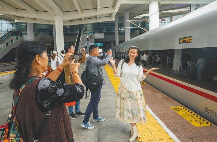 乘客在襄阳东站站台拍照留念。(湖北日报全媒记者 魏铼 摄)