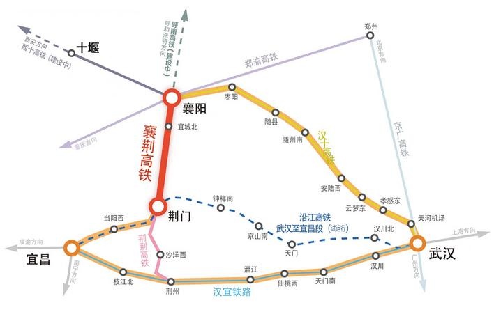 作为国家八纵八横呼南通道(呼和浩特至南宁)的重要组成部分,襄荆高铁北接郑渝高铁(郑州至重庆)、西武高铁(武汉至西安),南接沪渝蓉沿江高铁、荆荆高铁,并通过荆荆高铁与沪汉蓉快速客运通道相连。