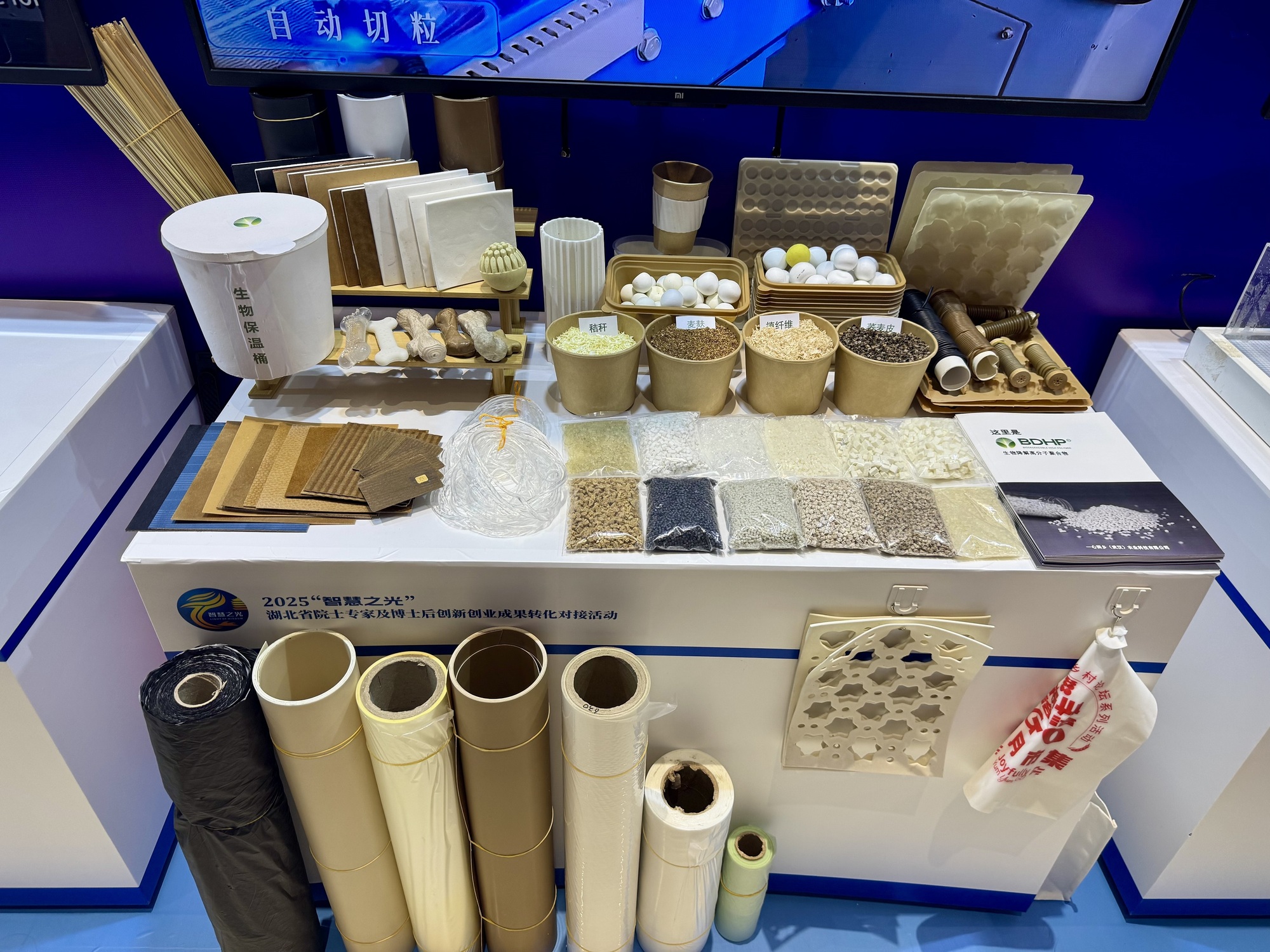 一心回乡农业科技公司展台前,用秸秆制成的吊秧绳、全降解地膜等产品吸引了众多目光。该企业总经理潘慧菁介绍,团队研发的生物降解材料成本已与普通塑料相当,在武汉市黄陂区等地推广应用,既解决了农业面源污染,又实现了固废资源化利用。