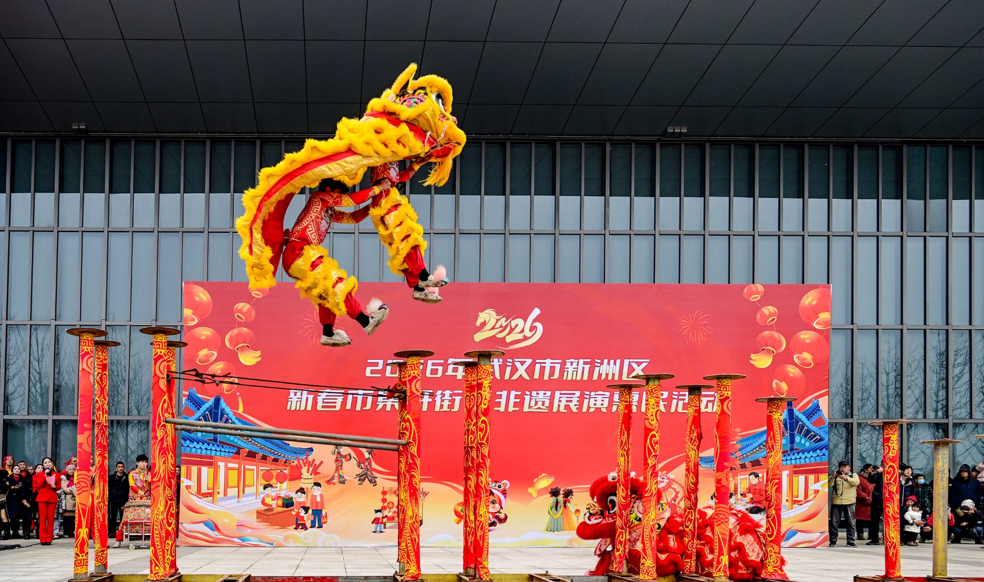 市集上,舞龙表演群龙起舞,上下翻飞,场面壮观;高桩狮舞表演中,舞狮者在高高的梅花桩上,舞动雄狮,翻转腾挪,令人叫绝。