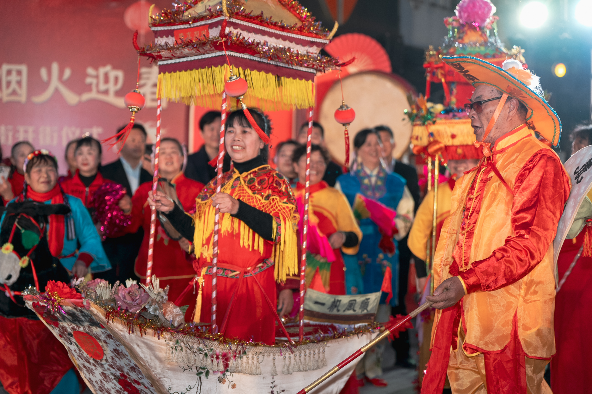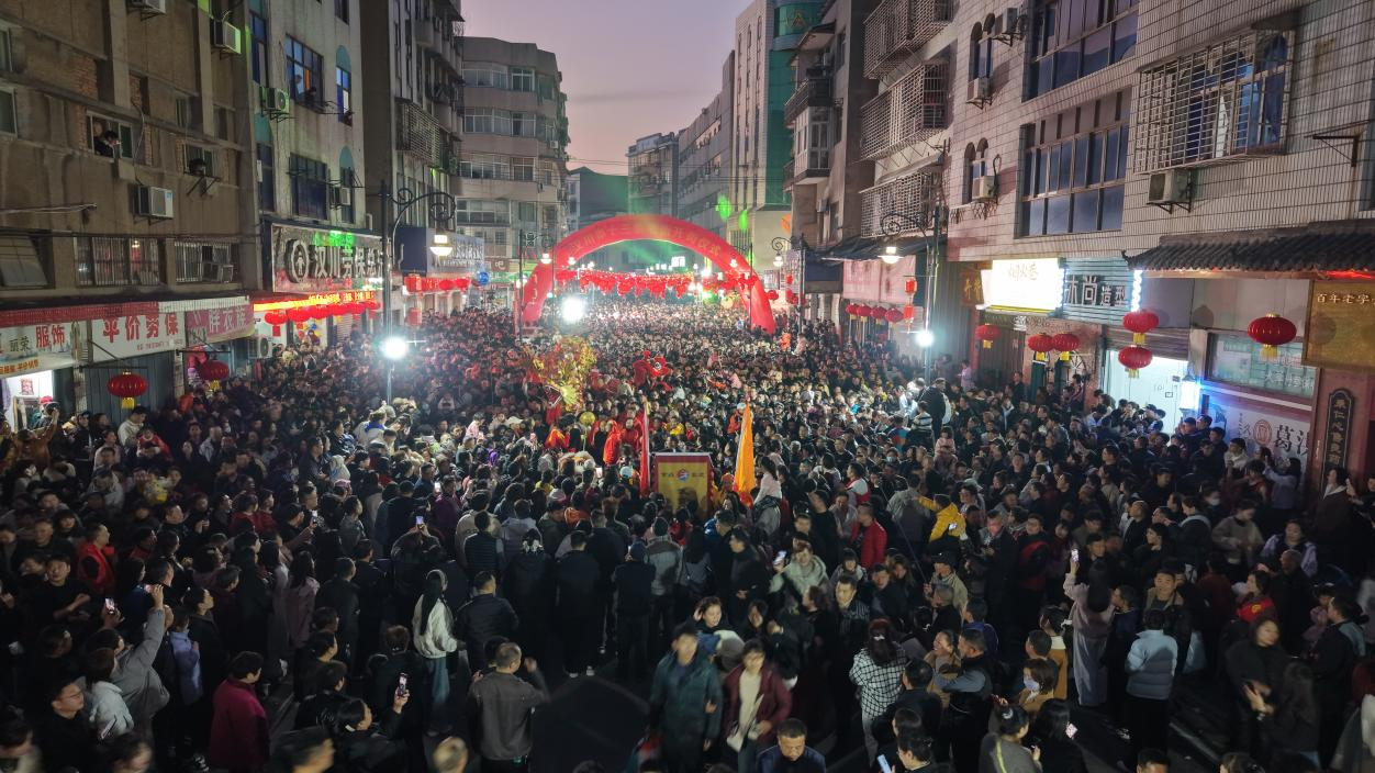暮色初临,西街口锣鼓震天。舞龙队金龙盘旋,舞狮队雄踞街心,蚌壳精舞者彩裙翻飞,划彩船艺人踏歌而行——四条非遗队伍自实验中学鱼贯而出,沿西街向十字街口浩荡进发。18时40分,东南西北四街口同步开演:保和堂门前的醒狮昂首、得力展示中心门前的游龙探爪、自来水公司城南营业所门前的蚌舞翩跹、济民堂门前的彩船摇曳,将百年老街瞬间拉回“灯火楼台十万家”的繁华盛景。