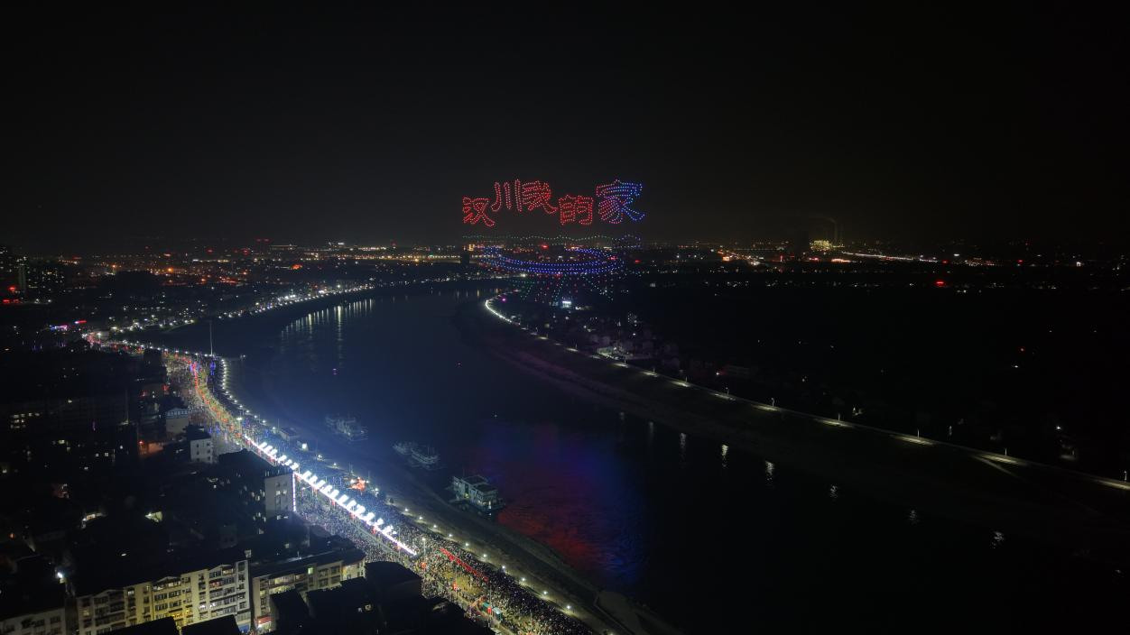 汉江马鞍乡当码村文化广场,1000架无人机如流萤般缓缓升空。以天为幕、以光为笔、以江为镜,无人机矩阵在夜空中依次幻化出12幅画面:“汉川我的家”五个温暖的大字在江面久久荡漾,凌波微步的水鸟掠过粼粼波光,盛开的荷花托起剪纸风格的“福”字,飞速旋转的齿轮映照产业新城的律动,腾空而起的巨龙盘旋成奋进的图腾……