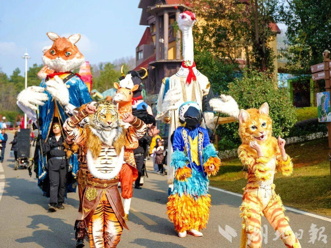 春节期间,园区的动物明星全员在岗,网红“快乐打工鸟”秃鹫每日在童话剧场定时亮相,棕熊、环尾狐猴、羊驼等萌宠也能与游客亲密互动。为烘托新春氛围,园区推出“奇幻迎新动物嘉年华”系列活动,动物主题巡游、特色舞台剧轮番上演,猫女与4米巨型木偶走上街头,与游客欢乐互动。园内还布置了多处新春打卡装置,免费随机派送伴手礼,让游客收获满满惊喜。