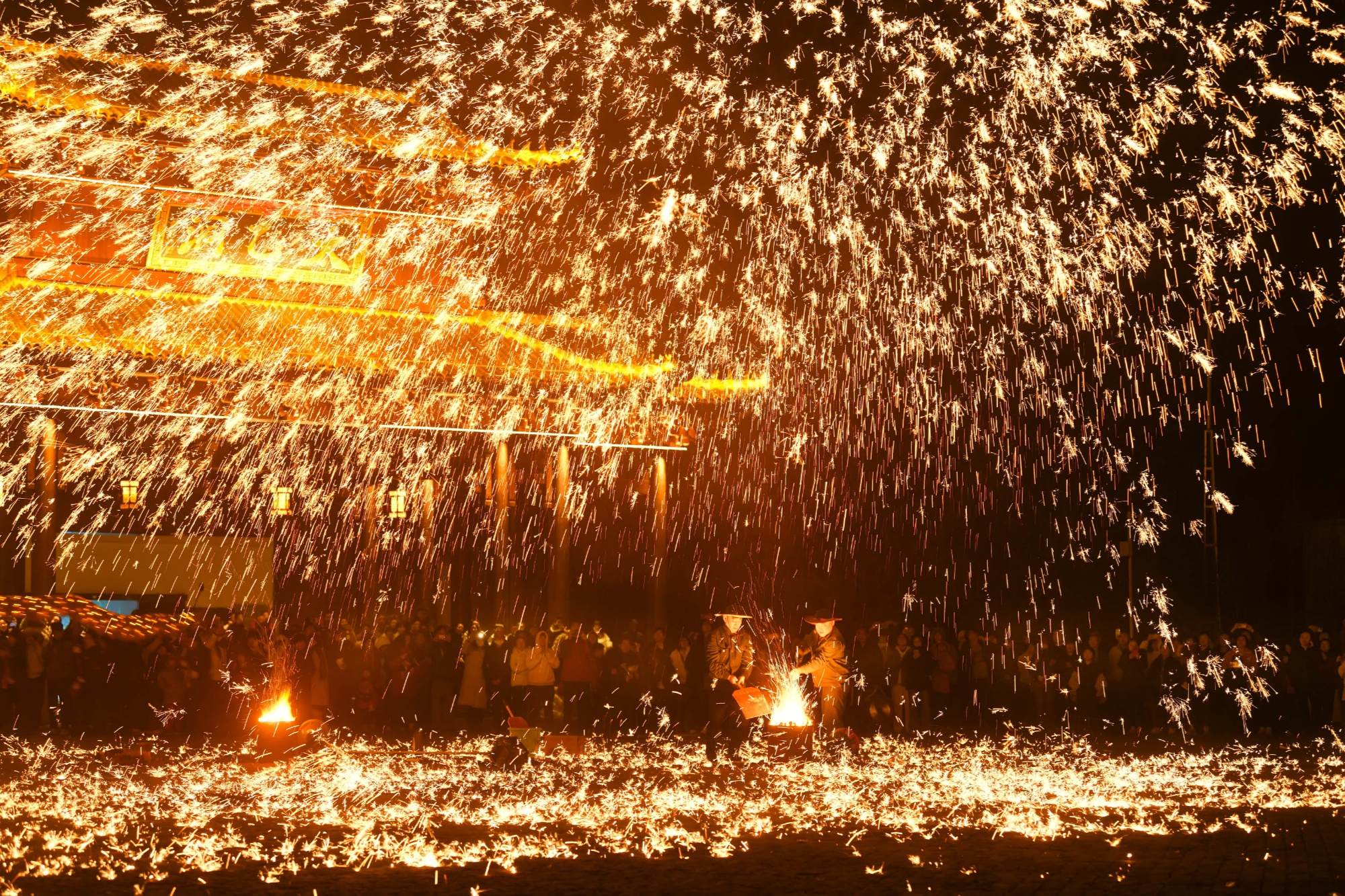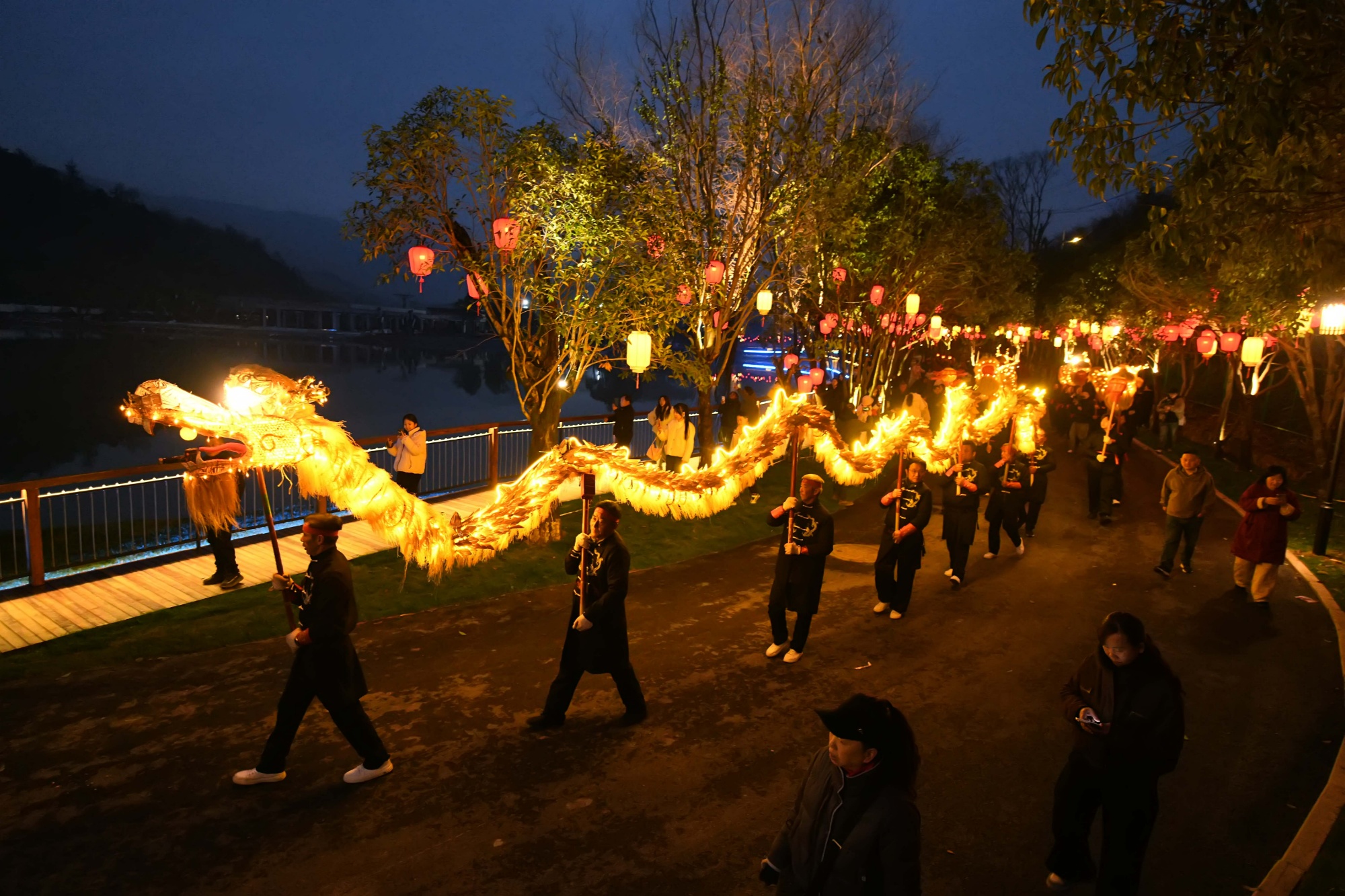 紧接着,踩莲船、打花鞭等充满乡土气息的民俗表演轮番登场,十余米长的“天河金丝龙”在夜色中上下翻飞,舞动生风,淋漓尽致地展现了咸安民间艺术的独特魅力。在“圆月散福”仪式中,演员们载歌载舞,通过祭“芒神”,祈求新的一年风调雨顺、五谷丰登。活动的尾声,游客们围聚在象征团圆与温暖的篝火旁,携手共舞,欣赏绚丽夺目的打铁花表演,在流光溢彩的夜色中,共同许下对未来的美好祈愿。
