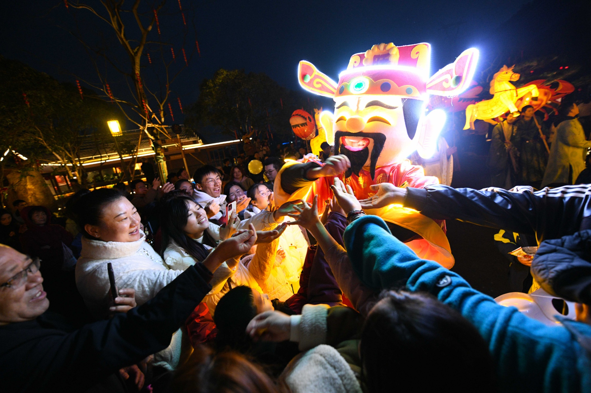 随着夜幕降临,活动渐入高潮。在斑斓的灯火映照下,一支由“冯京”“钱六姐”等咸宁历史名人扮演者组成的祈福巡游队伍,手持各式各样的花灯,在景区内款款而行,延续着古人元宵夜游赏灯的雅趣。巡游结束后,游客们纷纷上前,争相与“状元”合影留念,将这份独特的元宵记忆珍藏。